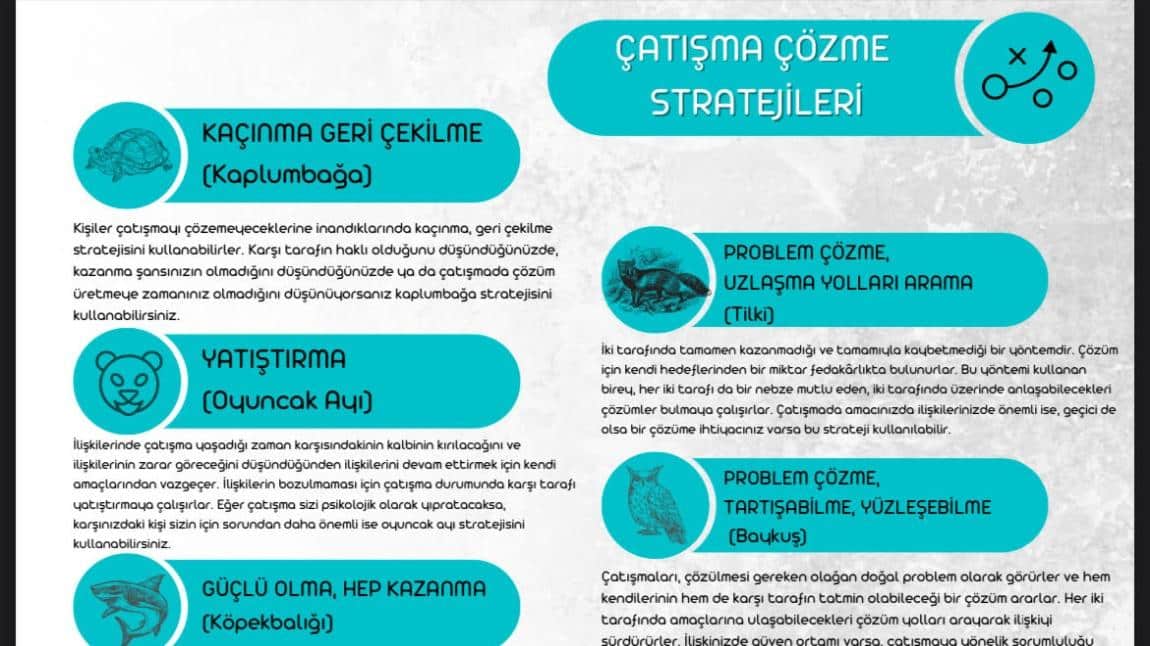 Johnson ve Johnson (1991), bir çatışma sıraında insanların beş farklı çözüm stratejisinden birini izleyebileceklerini belirmiş ve bu stratejileri hayvan figürleri ile simgelemişlerdir.